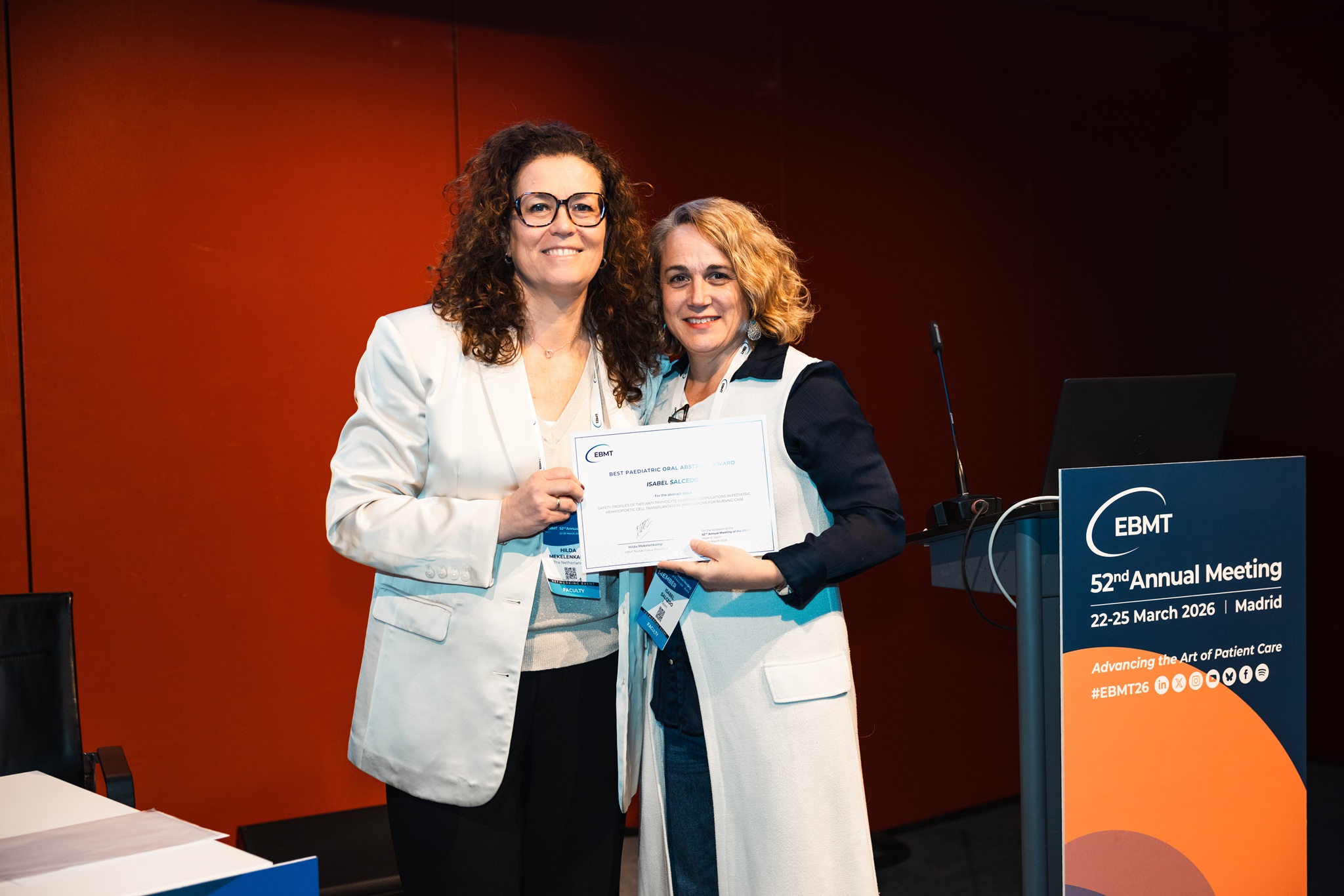 BEST PAEDIATRIC ORAL PRESENTATION ABSTRACT AWARD to Isabel Salcedo (Spain): SAFETY PROFILES OF TWO ANTI-THYMOCYTE GLOBULIN FORMULATIONS IN PEDIATRIC HEMATOPOIETIC CELL TRANSPLANTATION: IMPLICATIONS FOR NURSING CARE