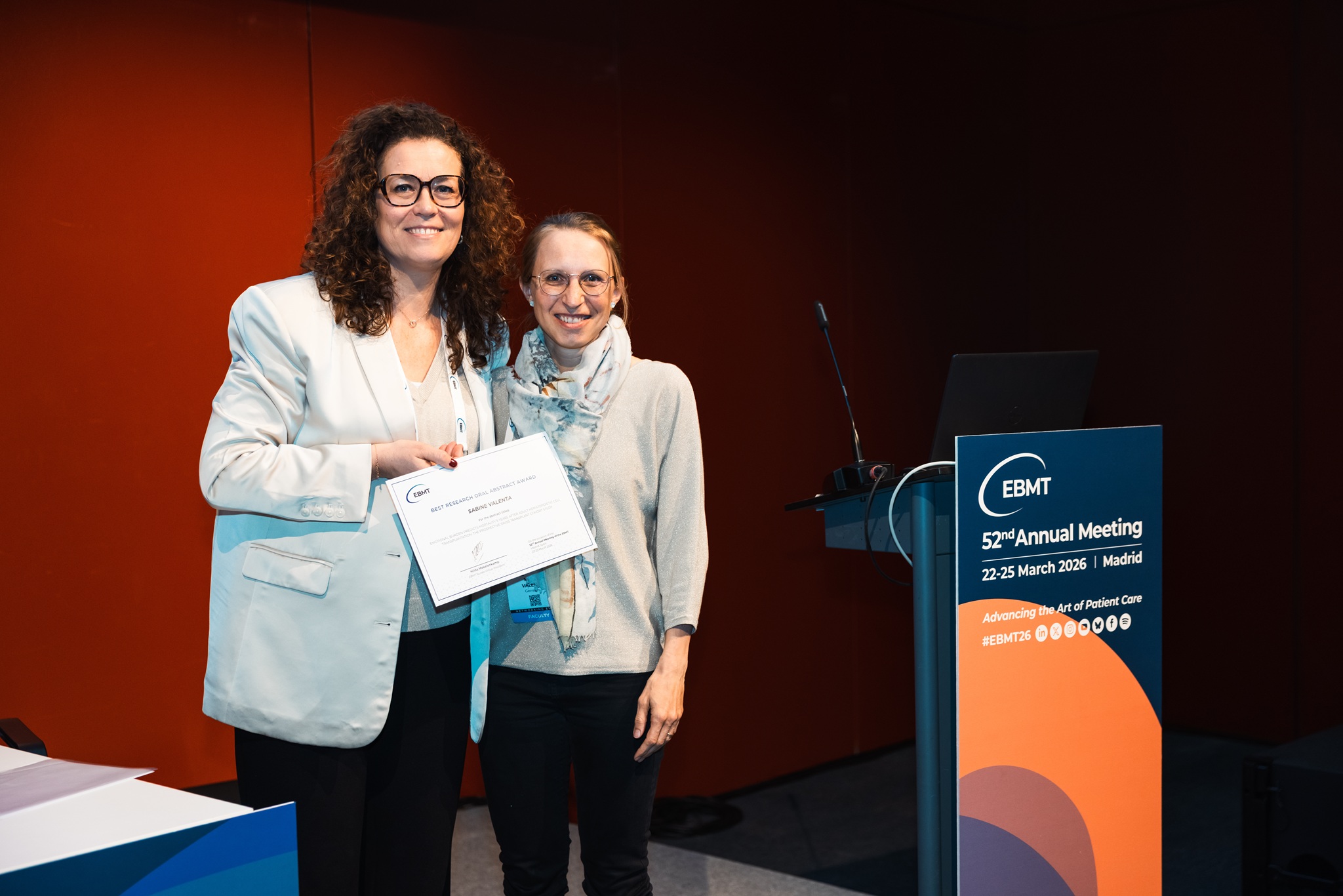 BEST RESEARCH ORAL PRESENTATION ABSTRACT AWARD to Sabine Valenta (Germany): EMOTIONAL BURDEN PREDICTS MORTALITY 5 YEARS AFTER ADULT HEMATOPOIETIC CELL TRANSPLANTATION: THE PROSPECTIVE SWISS TRANSPLANT COHORT STUDY