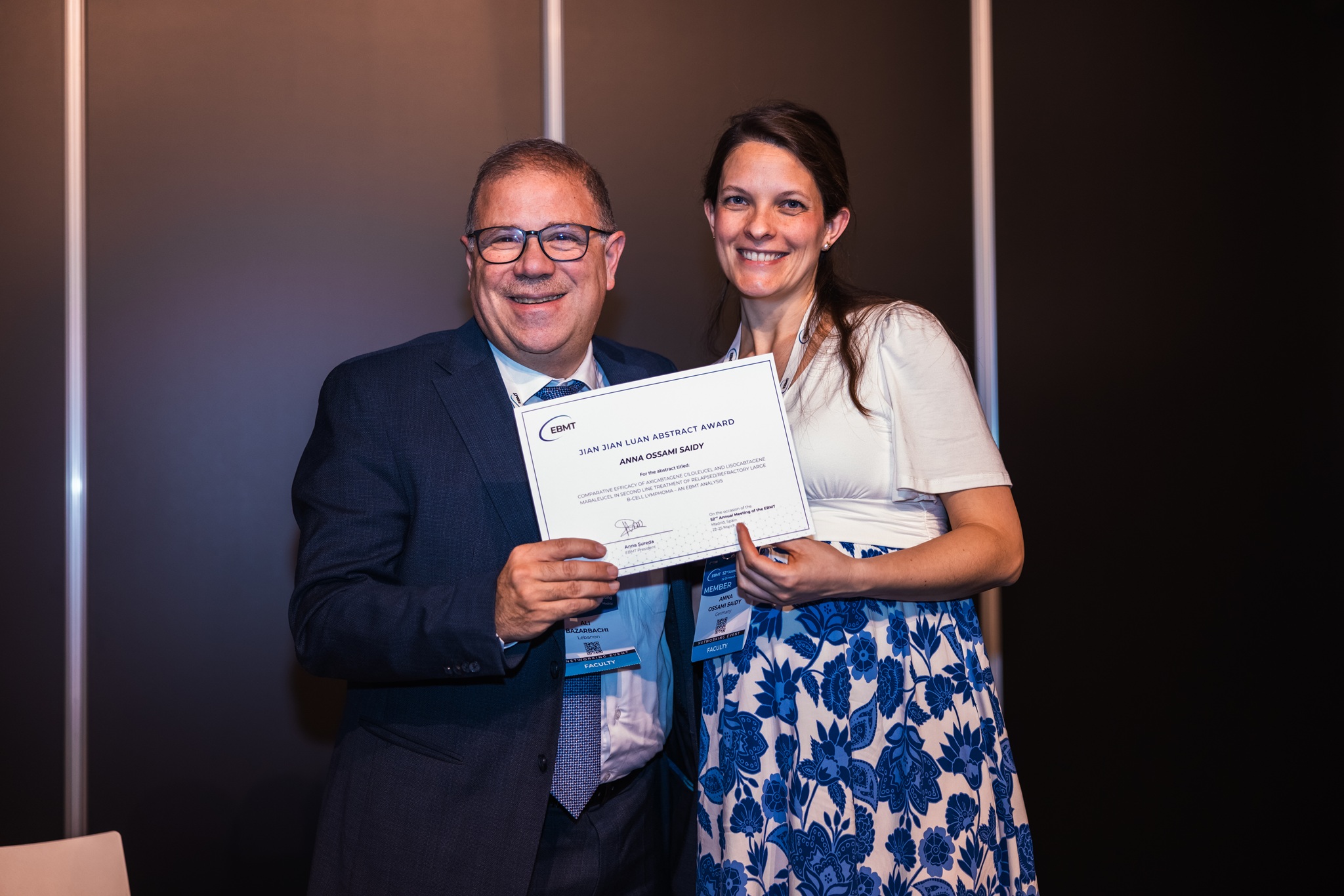 JIAN-JIAN LUAN AWARD FOR LYMPHOMA TRANSPLANT RESEARCH to Anna Ossami Saidy (Germany) for the study: COMPARATIVE EFFICACY OF AXICABTAGENE CILOLEUCEL AND LISOCABTAGENE MARALEUCEL IN SECOND LINE TREATMENT OF RELAPSED/REFRACTORY LARGE B-CELL LYMPHOMA – AN EBMT ANALYSIS