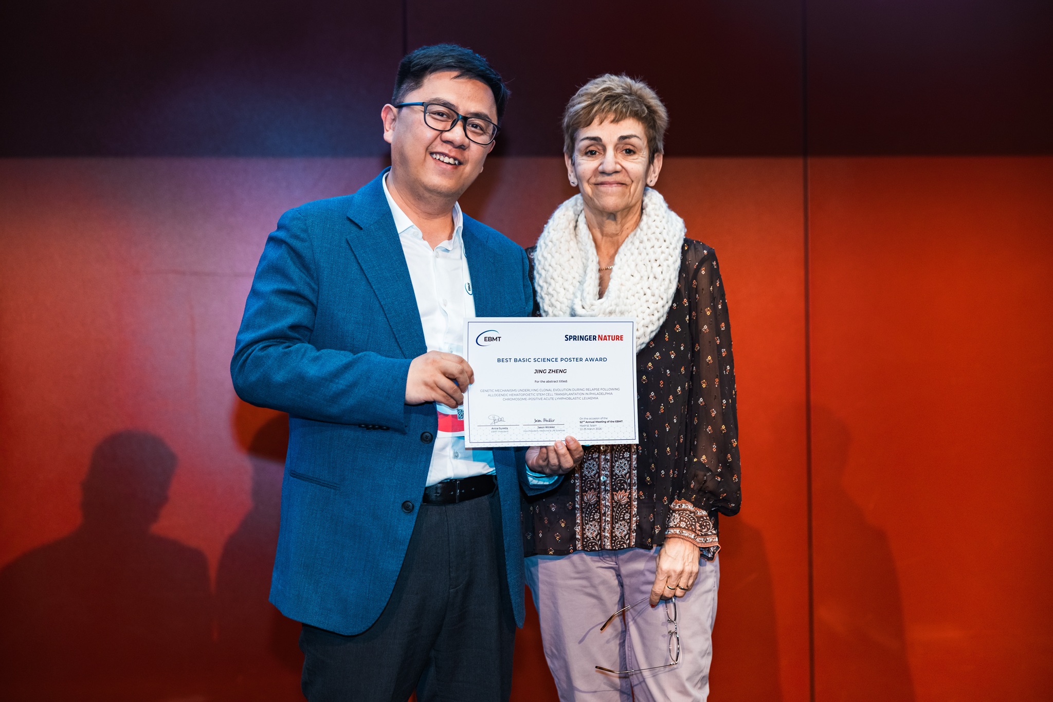 BEST BASIC SCIENCE POSTER AWARD to Jing Zheng (China): GENETIC MECHANISMS UNDERLYING CLONAL EVOLUTION DURING RELAPSE FOLLOWING ALLOGENEIC HEMATOPOIETIC STEM CELL TRANSPLANTATION IN PHILADELPHIA CHROMOSOME–POSITIVE ACUTE LYMPHOBLASTIC LEUKEMIA